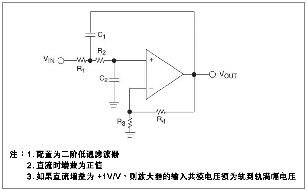 二階濾波電路受到另兩個參數(shù)的影響,Sallen-Key電路的輸入共模電壓范圍(VCMR)和輸入偏置電流(IB)。在Sallen-Key電路配置中,VCMR將限制輸入信號的范圍。如果不是電源應(yīng)用,則可不將電源電流作為關(guān)鍵參數(shù)進行考慮。