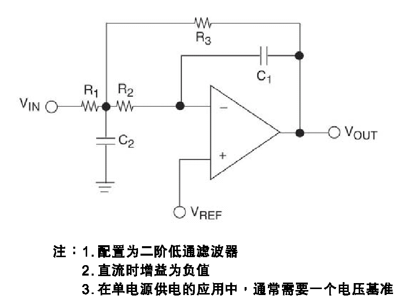 圖1中,非反相Sallen-Key濾波器設(shè)計為輸入信號不反相。通過R3和R4可以選擇增益值。如果您想得到+1V/V的直流增益,則應(yīng)將R3拆除并將R4短接。圖2顯示了一個二階多反饋電路配置。這種電路拓撲結(jié)構(gòu)下,輸入信號在參考電壓VREF處被反相了。如果需要更高階的濾波器,可將這兩種拓撲關(guān)系串接起來。