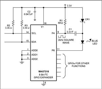 控制面板內通常設計有I²C GPIO擴展器,以適應遠距離傳輸。(采用一條串行總線來替代8根或者16根并行連線,實現(xiàn)更加方便;而且采用較小型的電纜和連接器,可節(jié)省成本)。您可以使用兩路GPIO口線來驅動LED。GPIO擴展器的每個I/O端口內置脈寬調制(PWM)電路,并具備50mA電流吸收能力,因此可以構成一個價格便宜的分立元件電荷泵。盡管該電荷泵的振蕩器開關頻率很低(2kHz),但由于LED只需要10mA驅動電流,所以該方法仍可以很好地工作。