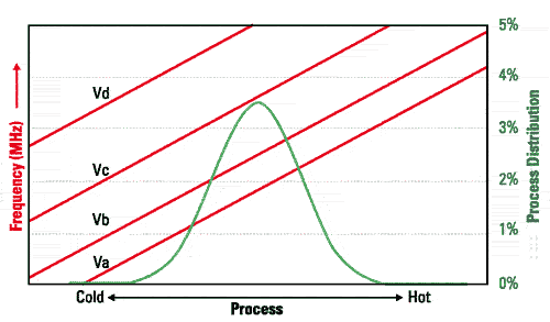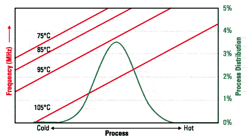 集成電路可以是由很多不同的硅工藝來(lái)制造,如今使用的工藝包括180nm、130nm和90nm工藝。集成電路的性能由底層工藝的特征來(lái)決定。當(dāng)制造商設(shè)計(jì)一個(gè)集成電路時(shí),他們目標(biāo)在于額定的工藝特征。但是,在制造器件時(shí)的工藝偏差有時(shí)候會(huì)需要的弱(冷),有時(shí)候又會(huì)比標(biāo)稱的器件強(qiáng)(熱)。熱器件可以提供比冷器件或標(biāo)稱器件更高級(jí)別的性能,反之亦然。典型關(guān)系見(jiàn)下頁(yè)中的圖2所示。