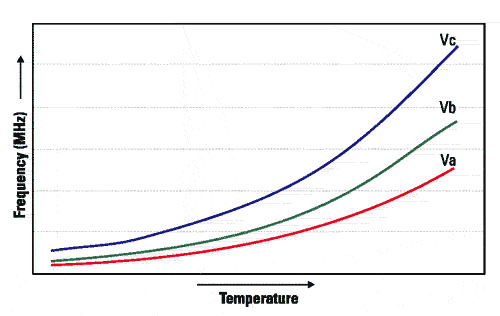 對(duì)于電壓,有同樣類似的關(guān)系,在電壓增加時(shí),器件能提供更好的性能。在圖3中,最小電壓Va決定了數(shù)據(jù)手冊(cè)中規(guī)定的性能,在更高的電壓處(相應(yīng)的Vb、Vc、Vd),性能也有改善的趨勢(shì)。