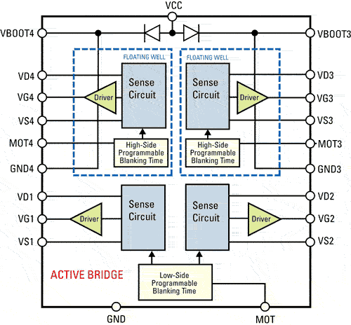 假如電壓高達(dá)600V,單集成電路方案可以集成自舉二極管,每個(gè)驅(qū)動(dòng)器部分均可通過(guò)專(zhuān)用的可配置消隱時(shí)間模塊來(lái)取代RC網(wǎng)絡(luò),讓設(shè)計(jì)能夠容納不同的場(chǎng)效應(yīng)管。另外,有關(guān)設(shè)計(jì)也可以把場(chǎng)效應(yīng)管、自舉電容器和控制功能集成到同一器件,成為現(xiàn)有二極管全波橋式整流器的直接替代品。這不僅能顯著節(jié)省功率,亦可大幅減少所需的印刷電路板空間。圖3展示了可供實(shí)現(xiàn)這種功能的集成動(dòng)態(tài)橋式器件。
