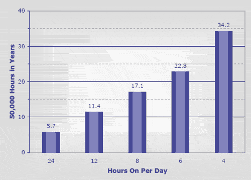 不過,在大多數(shù)照明環(huán)境下,燈有規(guī)律地熄滅。這一熄滅期足足可以將LED的使用壽命延長(zhǎng)到30年以上。過了這么多年之后,LED照明將“燒盡”,而那時(shí)LED照明技術(shù)下的照明將更亮、效率更高,與老式LED照明相比很可能要節(jié)省TCO。