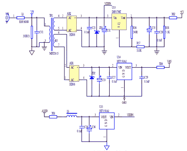 電能表的電源部分由電量計量電源電路、RS485通訊電源電路、MCU及其相關(guān)部分電源電路組成。以上電源電路通過電網(wǎng)輸入220V的交流電源,經(jīng)降壓、整流、穩(wěn)壓和濾波得到計量電路電源AVDD,RS485通訊電路電源V485、MCU及其相關(guān)部分電源+4V。整個電源電路主要使用HT7150A穩(wěn)壓芯片進行設(shè)計的,從而得到5V的直流電壓;對MCU及其相關(guān)部分電源電路則在降壓、整流后,通過并聯(lián)穩(wěn)壓集成電路LM317,調(diào)節(jié)R56、R57的比值,得到所需電壓值(4V)。