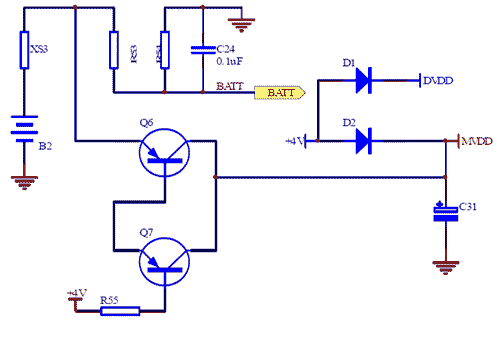 由于需解決電網(wǎng)停止供電時,實時時鐘必須能繼續(xù)計時的問題,在電表電路中,需要外加后備電池。上述電路中若電網(wǎng)正常供電,則Q6、Q7不能導(dǎo)通,電路從電網(wǎng)中取得電能,分別得到MCU電源MVDD及相關(guān)部分紅外通訊,存儲器等電源DVDD,但不能對電池供電。若電網(wǎng)停電時,則電池經(jīng)邏輯選擇的方式對MCU供電MVDD。