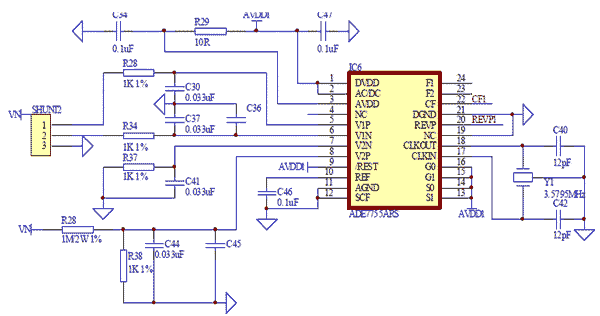 圖5所示為AD7755設(shè)計的電度表功率計量部分的工作原理圖。ADE7755計量電路設(shè)計詳見AD7755手冊。