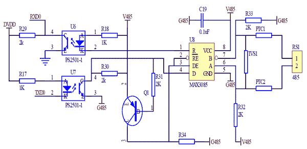 MAX3085是一個具有失效保護功能的RS485接口,電路通過兩個光藕器件對單片機電路和RS485總線電路進行隔離,提高系統(tǒng)的抗干擾能力,電路中的TVS1管并聯(lián)在RS485總線A、B線兩端,對電路進行瞬態(tài)保護作用,R32和R33為偏置電阻,進行網(wǎng)絡(luò)失效保護。RS485通訊電路中RS1接口是要進行瞬變脈沖和靜電干擾的,在設(shè)計和選擇485轉(zhuǎn)換芯片要特別注意這個問題。