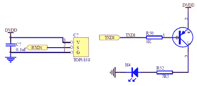 紅外通訊電路通過利用SH79F32內(nèi)部集成38K頻率發(fā)射器的EUART1模塊進行發(fā)送數(shù)據(jù);利用紅外接收集成電路TOP1838完成接收,并將信號輸入到微控制器的UART1接收引腳。