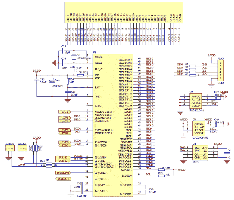 這部分電路由LCD顯示電路、存儲器電路、溫度檢測電路、仿真器接口JTAG電路及主控制MCU SH79F32周邊電路(包括內(nèi)部實時時鐘電路)等組成。存儲電路和溫度檢測電路都用I2C總線接口芯片。檢測溫度芯片LM75的內(nèi)部地址是90H,它主要用來對SH79F32內(nèi)部RTC進行溫度補償。