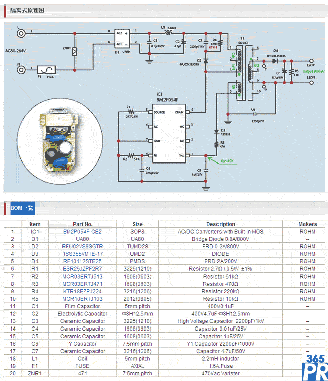 羅姆公司(ROHM)BM2P54F/BM2P094F參考設(shè)計(jì)Ver.1.1采用BM2P系列LED驅(qū)動(PWM控制方式AC/DC Converter,內(nèi)置MOS),外圍電路結(jié)構(gòu)簡單,適用于小型的球泡燈與LED臺燈等。另外,由于可以實(shí)現(xiàn)簡易的PWM調(diào)光和線性調(diào)光,可適用于具有調(diào)光功能的LED照明產(chǎn)品,例如LED球泡燈/射燈(GU10/MR16/JDR50)、LED臺燈等。