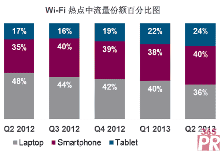 圖1. 現(xiàn)在智能手機(jī)在Wi-Fi熱點(diǎn)流量中所占份額已經(jīng)超過(guò)筆記本電腦。(數(shù)據(jù)來(lái)源:JiWire)