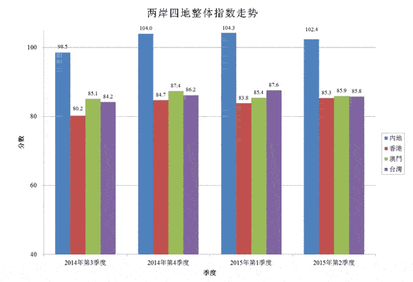 將兩岸四地的2015年第二季度消費(fèi)者信心互相比較,可見中國內(nèi)地的信心最高(102.4分),隨后澳門(85.9分),臺(tái)灣(85.8分),以及香港(85.3分)在本季度大致相若。