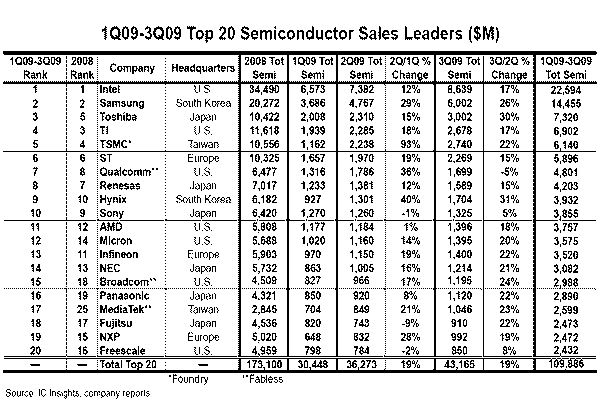 基于前三個(gè)季度的整體銷售額,IC Insights評(píng)出了全球20大半導(dǎo)體廠商,英特爾仍排名首位,前三個(gè)季度銷售額為225.94億美元。三星位居第二,銷售額為144.56億美元。