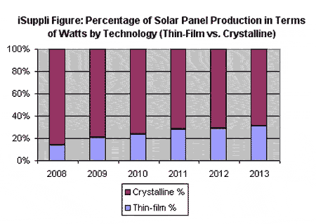 【產(chǎn)通社,11月15日】iSuppli公司消息,薄膜太陽能電池正在迅速攫取晶體技術已有的市場份額,到2013年,其光伏部分的瓦特數(shù)會增加一倍多。到2013年,在全球太陽電池板市場上,薄膜的效率將從2008年的14%增加到31%。