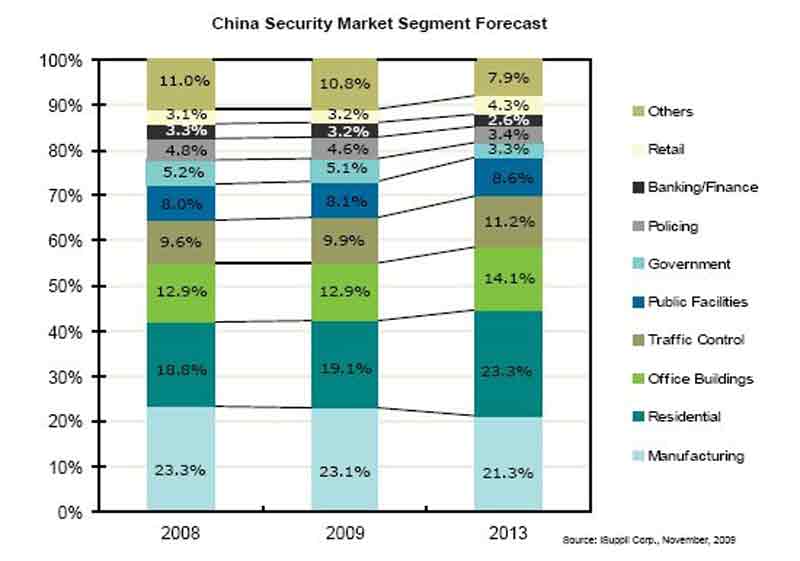 到2013年,住宅領(lǐng)域占中國(guó)安防與監(jiān)控市場(chǎng)總體營(yíng)業(yè)收入的份額預(yù)計(jì)將上升到23.3%,而2008年是18.8%。這將使其超過制造領(lǐng)域,成為安防和監(jiān)控市場(chǎng)中最大的單一領(lǐng)域。