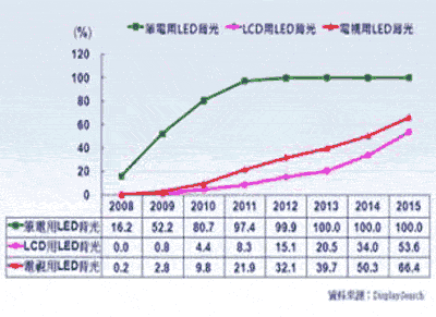 從應(yīng)用端觀察,LED TV肯定是今年最耀眼的一顆星,JP Morgan、瑞銀證券等機構(gòu)認為今年全球LED TV出貨量會超過3000萬臺。LED TV如此高倍速的成長,為LED整體供應(yīng)鏈帶來了極大的成長動能。
