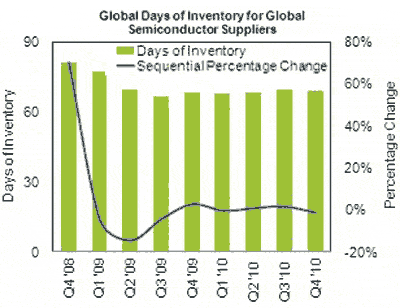 雖然第四季度末的庫存水平低于歷史平均水平,半導(dǎo)體供應(yīng)商的DOI在此期間實際上還是略微增長了,比第三季度的66.7上升了2.7%。