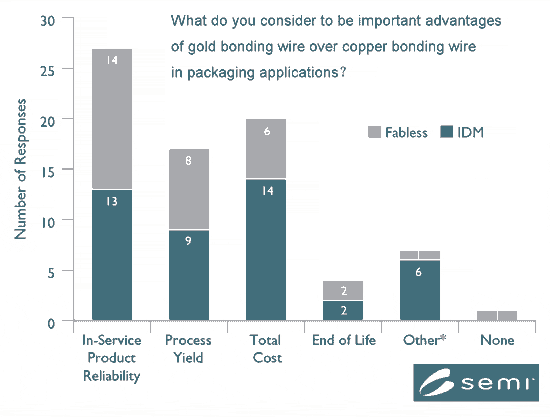 (2)為了控制成本,72%的受訪公司表示考慮在新產(chǎn)品中使用銅線(xiàn)制程來(lái)取代原本的金線(xiàn)制程,而另13%的公司更考慮將銅線(xiàn)制程用于主力產(chǎn)品中,其他15%的公司則暫時(shí)不考慮轉(zhuǎn)換到銅線(xiàn)制程,其主要考量點(diǎn)包括:產(chǎn)品的可靠性、制程良率和銅線(xiàn)制程的效能尚未被長(zhǎng)時(shí)間驗(yàn)證。