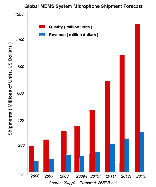 iSuppli公司數(shù)據(jù)顯示,盡管在2009年放緩,但由于受到手機(jī)和其他應(yīng)用的青睞,2008-2013年微機(jī)電系統(tǒng)(MEMS)麥克風(fēng)的全球出貨量有望增長(zhǎng)兩倍以上。預(yù)計(jì)2013年全球MEMS麥克風(fēng)出貨量將達(dá)到11億個(gè),遠(yuǎn)高于2008年時(shí)的3.285億個(gè)。雖然這種增長(zhǎng)前景非常強(qiáng)勁,但預(yù)計(jì)2009年出貨量增長(zhǎng)減速且全球營(yíng)業(yè)收入下降,這將是該市場(chǎng)歷史上的首次收縮。