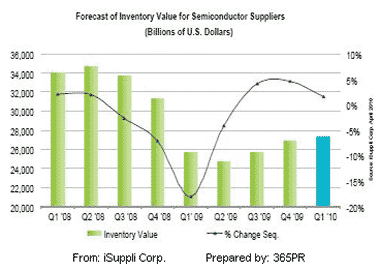 iSuppli公司的分析顯示,2009年第四季度,半導(dǎo)體供應(yīng)商的庫(kù)存天數(shù)(DOI)持穩(wěn)在68.3天,比經(jīng)季節(jié)調(diào)整的歷史平均水平低6%。
