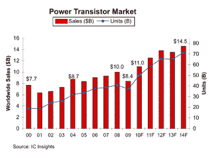 IC Insight預(yù)測,功率晶體管市場在2014年將達(dá)到145億美元,而2009年為84億美元,表示年均增長率CAGR達(dá)12%。在未來5年內(nèi),功率晶體管出貨量的CAGR達(dá)到14%,從2009年的371億個增加到713億個。