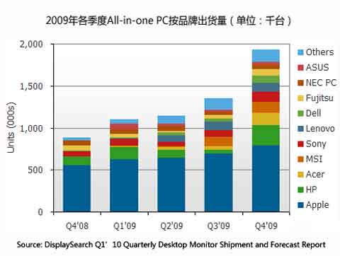 【產(chǎn)通社,4月28日訊】DisplaySearch公布的第一季桌上型顯示器出貨預(yù)測報(bào)告顯示,2009年一體化計(jì)算機(jī)(All-in-one PC,AIOs)出貨量超過550萬臺(tái),年成長率高達(dá)57%。不只是一線廠商如iMac、HP、Dell、Lenovo與Acer(包括Gateway與Packard Bell)出貨成長,二線品牌廠商如微星(MSI)也都有很好的成長。同時(shí),幾乎所有品牌廠商對(duì)于無論是消費(fèi)者市場或者商用市場產(chǎn)品擴(kuò)張都相對(duì)積極,因此估計(jì)AIOs成長將有機(jī)會(huì)像notebook PC市場一樣旺盛。
