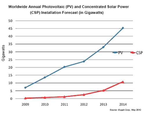 隨著新安裝容量呈現(xiàn)爆炸性增長(zhǎng),太陽(yáng)熱能,即太陽(yáng)能聚熱發(fā)電(CSP)正在蓬勃發(fā)展。預(yù)計(jì)2014年整年的全球CSP安裝容量將達(dá)到10.8GW,而2009年只有0.29GW。相比之下,2014年的PV裝機(jī)容量將為45.2GW,而2009年是7.0GW。