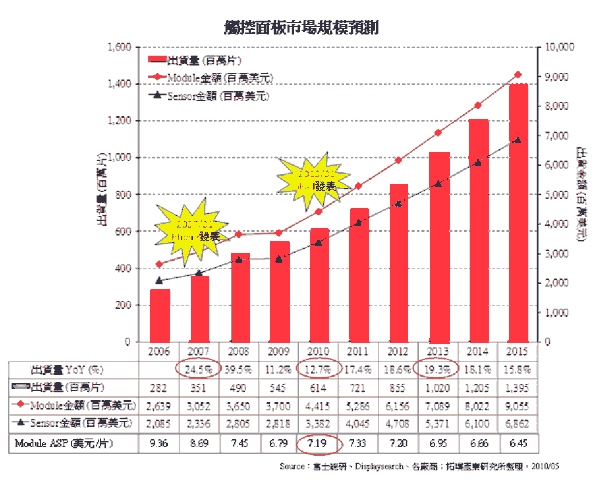 拓墣產(chǎn)業(yè)研究所(TRI)數(shù)據(jù)顯示,全球觸控面板出貨量將由2009年的5.45億片,成長至2011年的7.21億片,觸控面板模塊之出貨金額則從2009年的37億美元上升至2011年的52.86億美元。其中,2010年全球觸控面板出貨量之年增率(YoY)為12.7%,觸控面板模塊出貨金額之YoY達19.3%,整體市場每片的平均售價(ASP)逆勢成長至7.19美元,其主要原因在于5-10吋間的觸控面板市場需求受iPad與平板機等新興產(chǎn)品之發(fā)表刺激,推波助瀾所致。