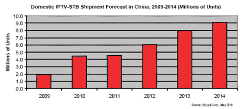 中國IPTV-STB市場快速增長,符合該國IPTV用戶的增長前景,估計(jì)用戶數(shù)量到2014年將達(dá)到3170萬個。2010年一年,預(yù)計(jì)IPTV用戶就將跳增到850萬,幾乎是2009年440萬的兩倍。