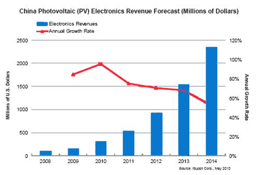 隨著政府補(bǔ)貼計(jì)劃在2010年達(dá)到頂點(diǎn),光伏電子市場(chǎng)也將同時(shí)觸頂。盡管預(yù)計(jì)接下來(lái)三年年增長(zhǎng)率下降——除非出臺(tái)新的政策,但該市場(chǎng)將繼續(xù)保持一定的勢(shì)頭,足以在2014年實(shí)現(xiàn)24億美元的銷售收入。