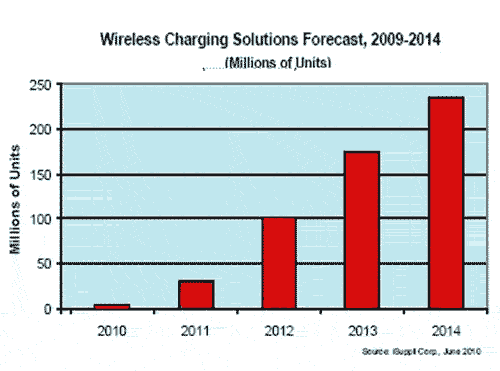 在產(chǎn)品專用無線充電方面,預(yù)計(jì)2010年解決方案將增長(zhǎng)到360萬個(gè),而去年只有20萬個(gè)。從明年開始,出貨量將急劇增長(zhǎng):2011年出貨量將達(dá)到3100萬個(gè),2012年上升到1.018億個(gè),2013年達(dá)到1.742億個(gè),2014年底增長(zhǎng)到2.349億個(gè)。預(yù)計(jì)無線充電售后市場(chǎng)的增長(zhǎng)同樣驚人,五年的復(fù)合年度增長(zhǎng)率高達(dá)133.4%,到2014年總體銷售收入將增長(zhǎng)29億美元。產(chǎn)品專用解決方案包括充電器以及所謂的“皮膚”,即與特定產(chǎn)品一同銷售的接收器,而售后市場(chǎng)解決方案則包括通用充電器和可以與多種消費(fèi)電子設(shè)備配合使用的各類皮膚。