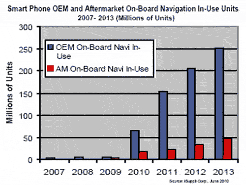 多數(shù)付費售后on-board活動目前發(fā)生在蘋果iPhone上面,因為導航不是其預裝應用。迄今為止,iPhone約占總體售后on-board導航銷售總數(shù)的50%,估計2009年銷量超過290萬個。