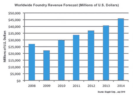 因此,iSuppli公司把2010年純晶圓代工廠商的營收增長預(yù)測上調(diào)了2.8個(gè)百分點(diǎn),從先前預(yù)測的39.5%調(diào)高到42.3%的增長率,即從2009年的221億美元增加到298億美元。預(yù)計(jì)到2014年,總體純晶圓代工產(chǎn)業(yè)的營業(yè)收入將從2008年的268億美元上升到459億美元,復(fù)合年度增長率為9.4%。