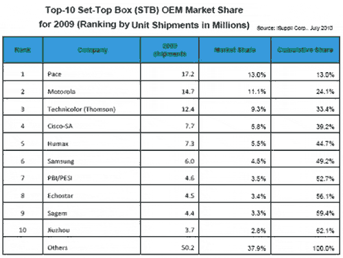 與此同時(shí),2009年市場(chǎng)份額數(shù)據(jù)顯示,隨著Pace公司完成對(duì)飛利浦STB業(yè)務(wù)的收購(gòu),正在成為新的市場(chǎng)份額王者。