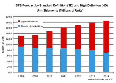 高清STB的出貨量最近幾年保持快速增長(zhǎng)。2009年,高清STB出貨量增長(zhǎng)600萬(wàn)個(gè)以上,從2008年的3910萬(wàn)個(gè)增長(zhǎng)到4520萬(wàn)個(gè)。到2012年,高清STB出貨量將首次超過(guò)標(biāo)清(SD)STB。到2014年,高清STB將達(dá)到1.14億個(gè),復(fù)合年度增長(zhǎng)率為20.3%。