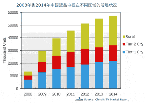 DisplaySearch預(yù)估,中國(guó)平面電視的出貨量將從2009年的3100萬(wàn)臺(tái),大幅成長(zhǎng)至2014年的5900萬(wàn)臺(tái),年復(fù)合成長(zhǎng)率為14%。而平面電視的市場(chǎng)滲透率將從2009年72%成長(zhǎng)到2014年接近100%,傳統(tǒng)映像管電視屆時(shí)將完全消失。