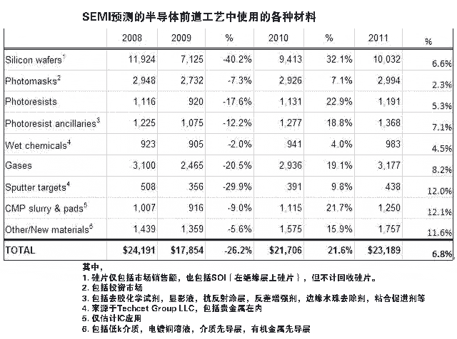 進(jìn)入2010年中增長較慢,僅個位數(shù)增長的大類有(硅片,氣體,掩模/光刻膠/光刻用輔助料),而在12%左右增長的有CMP,濺射靶及其它。