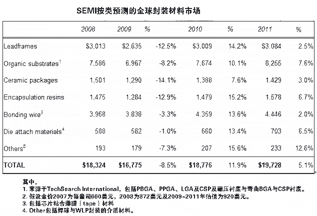 預(yù)測到2011年,封裝材料將下降到個位數(shù)的增長,雖然其它others類包括如硅片級封裝WLP的介質(zhì)材料及焊球,它們的增長率都在低的兩位數(shù)。注意到鍵合線在2011年減緩,看到幾乎很少有的2%增長,但還是比引線框架leadframes多(盡管leadframes出貨量己經(jīng)超過下降周期之前水平)