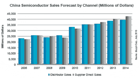 iSuppli公司估計,2009年中國的半導體銷售額中,有52%是通過分銷渠道實現(xiàn)的,相當于257億美元。2009年分銷商銷售額比2008年增長7.6%,而原廠直銷額則下降了4.6%,一個主要原因是一些主要采取直銷方式的領先供應商在2009年銷售額下降。但在未來五年,半導體原廠在中國將提高直銷比例。