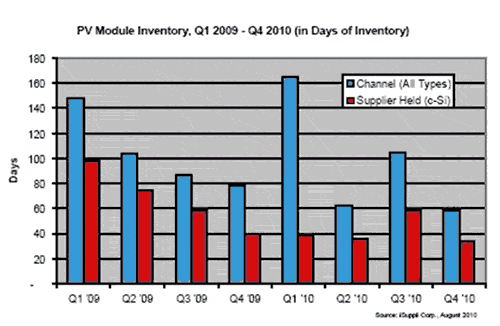 iSuppli公司的數(shù)據(jù)顯示,在這些因素的影響下,光伏渠道庫存在2010年第一季度末上升,這種情形將在第三季度再度浮現(xiàn)。同時,庫存趨于穩(wěn)定。這是夏季德國削減電價補貼以及安裝商降低價格的結(jié)果。安裝商在此期間為了維持市場份額,紛紛降低價格。