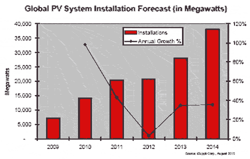 【產(chǎn)通社,8月9日】2010年光伏產(chǎn)業(yè)增長快速,今年有望擴大一倍,但市場波動問題也給一些能力不濟的企業(yè)帶來災(zāi)難,最終可能被永遠取代。預(yù)計今年全球光伏裝機容量將增長到14.2GW,比2009年的7.2GW大增97.2%,而且也沒有明年降溫的跡象。