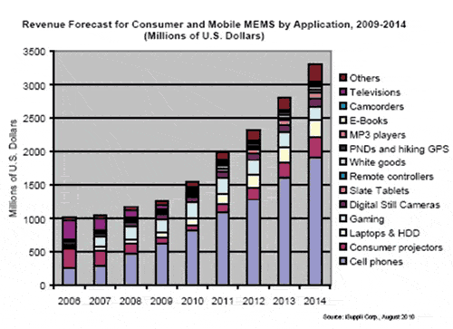 總體來看,新型MEMS器件到2014年將額外帶來13億美元的銷售額,而2009年只有3300萬美元。