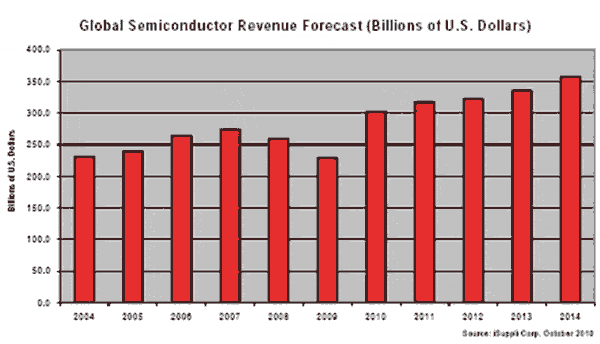 2010年半導體產業(yè)從2009年的慘淡局面中反彈,銷售額處于至少七年來的最高水平,甚至將超過2007年創(chuàng)下的高峰2742億美元。