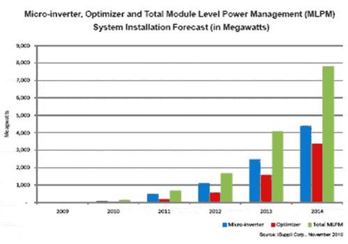 因為MLPM系統(tǒng)可以在單個模組層面,而不是在整個模組串層面,提高能量收集,所以MLPM系統(tǒng)開始受到歡迎。安裝場所不同,效果也有差異。比如在“遮蔽”情況下,MLPM解決方案在一年時間內,可以多采集3-20%千瓦時的光伏電量。雖然其每瓦成本大大高于傳統(tǒng)變頻器,但成本差異正在迅速縮小。因此,預計到2014年MLPM總體出貨量預計將達到7.8GW,而2009年只有30MW,其間的復合年度增長率高達204.3%。
