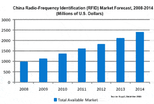 【產(chǎn)通社,12月24日】經(jīng)過多年的發(fā)展之后,中國的射頻識別(RFID)半導體市場未來幾年將突飛猛進,達到巨大的規(guī)模,2009-2014年銷售額將增長一倍以上。預計2010年中國RFID市場將增長到14億美元,比2009年的11億美元增長22%。但這與接下來的幾年相比就相形見絀了。到2014年,RFID市場將達到24億美元,是2009年的兩倍多。