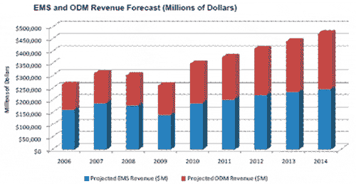 【產(chǎn)通社,1月13日】2011年全球外包制造產(chǎn)業(yè)將來到十字路口。預計2010年總體產(chǎn)業(yè)營業(yè)收入從2009年的2600億美元增長到3470億美元,鑒于去年復蘇勢頭比較強勁,普遍預期該產(chǎn)業(yè)將保持相對較高的擴張速度。iSuppli公司預計,2011年該產(chǎn)業(yè)營業(yè)收入將增長8.5%。但令人擔憂的是,許多全球性宏觀經(jīng)濟問題仍未得到解決,而正是這些問題導致2009年該產(chǎn)業(yè)的營業(yè)收入急劇下滑。2009年全球需求不振。iSuppli公司認為,到2014年,營業(yè)收入將達到4723億美元。