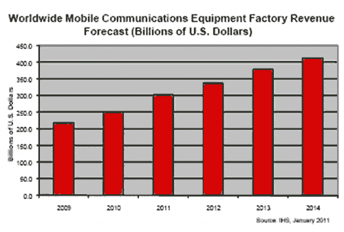 2011年無線通訊設備的工廠營業(yè)收入預計達到3027億美元,比2010年的2511億美元勁增20.6%。其增長率高于去年的15.1%,而且未來幾年沒有減速跡象。到2014年,該產(chǎn)業(yè)的營業(yè)收入將增加1000億美元,全球設備營業(yè)收入總計將達到4133億美元。無線通訊設備市場涉及多種產(chǎn)品,包括手機、移動基礎設施、移動與固定無線寬帶接入設備、無線LAN設備,如路由器、無繩電話與手機電池充電器。