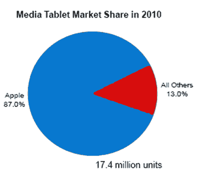 在2011年CES上走一走,就能明顯感覺到平板時(shí)代已撲面而來。展會(huì)上展出的新款平板電腦不計(jì)其數(shù)?紤]到iPad的威力和它在市場中的統(tǒng)治地位,IHS iSuppli公司的研究顯示,2010年蘋果占有87.0%的市場份額。顯然,各家公司都在拼命以各種手段從蘋果手中奪得一席之地。