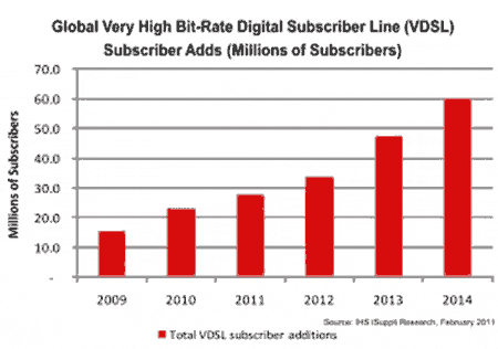 【產(chǎn)通社,2月24日】據(jù)IHS iSuppli公司的最新研究,由于更多的廠商開始加大對甚高速數(shù)字用戶線(VDSL)的支持,該市場用戶到2014年將增長三倍以上。
