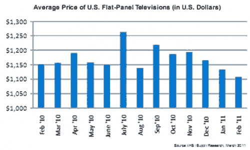 【產(chǎn)通社,3月8日】據(jù)IHS iSuppli公司的研究,由于制造商清理舊型號(hào)存貨并為2011年新款產(chǎn)品騰出空間,2月份美國(guó)平板電視價(jià)格連續(xù)第三個(gè)月下跌。2月份美國(guó)電視平均價(jià)格降至1108美元,比1月的1134美元下降2.3%,21-29英寸與50英寸以上的百分比降幅最大。2月價(jià)格比去年同期的1151美元下降3.7%。